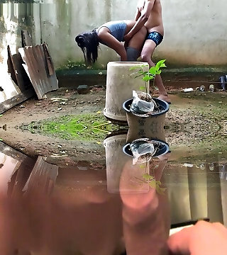 Sex with the voyeur gardener with a girl in a short sundress without undies